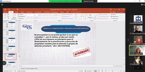 A través de acciones generada en articulación CNII – Consejo de Participación Ciudadana, las/os participantes accedieron al módulo 4 de incidencia en la gestión de lo público, adquirieron conocimientos sobre planificación participativa, fases, normativa y niveles operacionales de la planificación, competencias de los diferentes niveles de gobierno, presupuesto participativo.