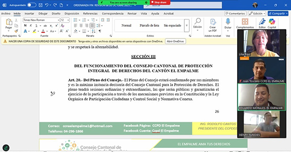 En la provincia del Guayas, trabajamos telemáticamente con el equipo del Consejo Cantonal para la Protección de Derechos y el delegado del Gobierno Autónomo Descentralizado Municipal del cantón El Empalme. Se elaboró una propuesta de Ordenanza de Protección Integral de Derechos que sustituya a la actual, la cual conformó el Consejo y la Junta Cantonal de Protección de Derechos del cantón. Se acordó mantener una reunión más para darle una mirada general y, a partir de allí, presentarla en sesión del Consejo Cantonal para la Protección de Derechos e, inmediatamente, al Concejo Municipal.