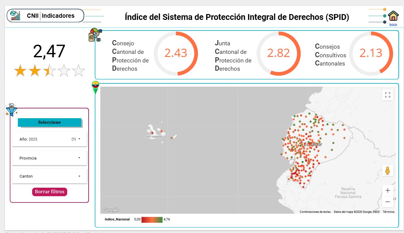 El año 2025, cerró con una media de puntuación nacional de 2,47 sobre 5, por lo cual se trabajará en la mejoría de estos indicadores en los territorios que más lo requieren, ya que el diagnóstico del Sistema de Protección Integral de Derechos, permite establecer el índice de implementación a nivel cantonal, provincial y nacional.