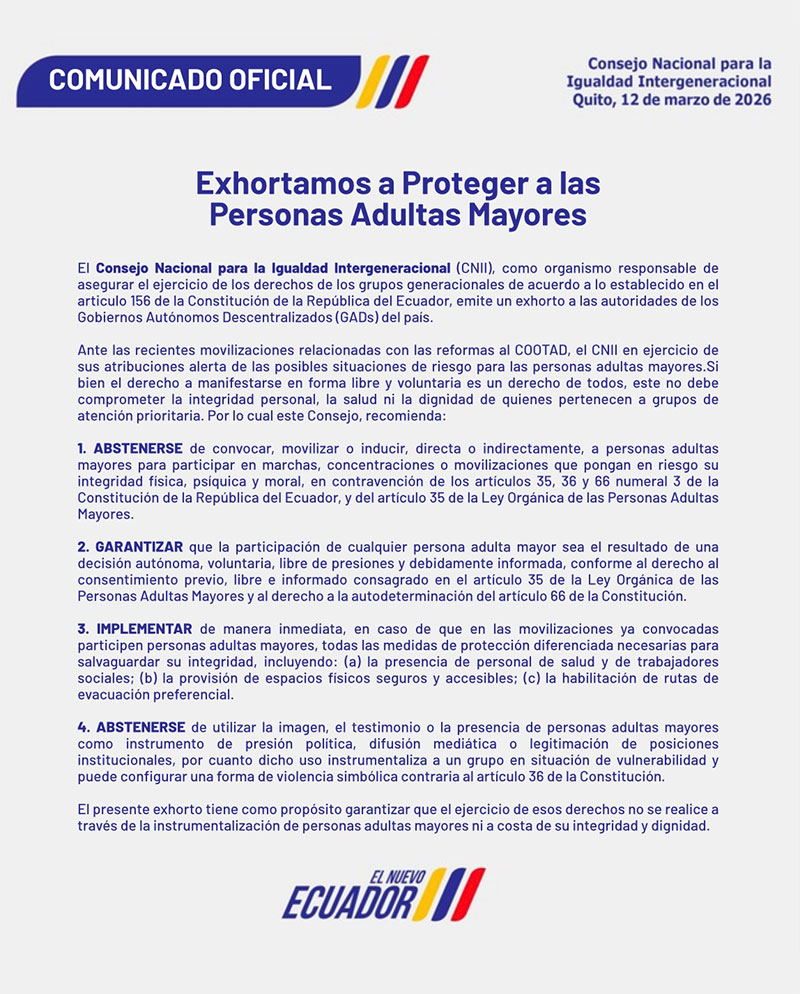 Consejo de Igualdad Intergeneracional > Noticias > Comunicado Oficial: Exhortamos a los gobiernos autónomos descentralizados a proteger la integridad de las personas adultas mayores.