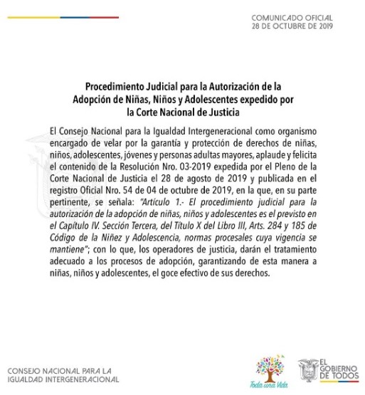 Consejo de Igualdad Intergeneracional > Noticias > COMUNICADO: Procedimiento Judicial para la Autorización de la Adopción de Niñas, Niños y Adolescentes expedido por la Corte Nacional de Justicia