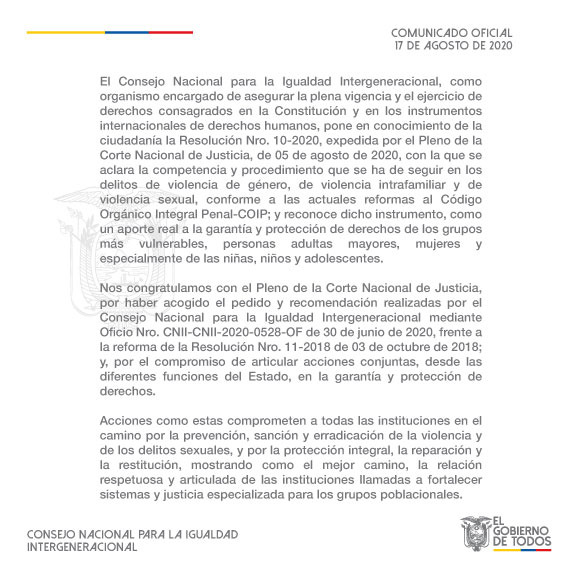 El #CNII se congratula con la Resolución Nro. 10-2020 de la Corte Nacional de Justicia, que a través la gestión institucional, se expidió con la finalidad de garantizar y proteger los derechos de los grupos de atención prioritaria.