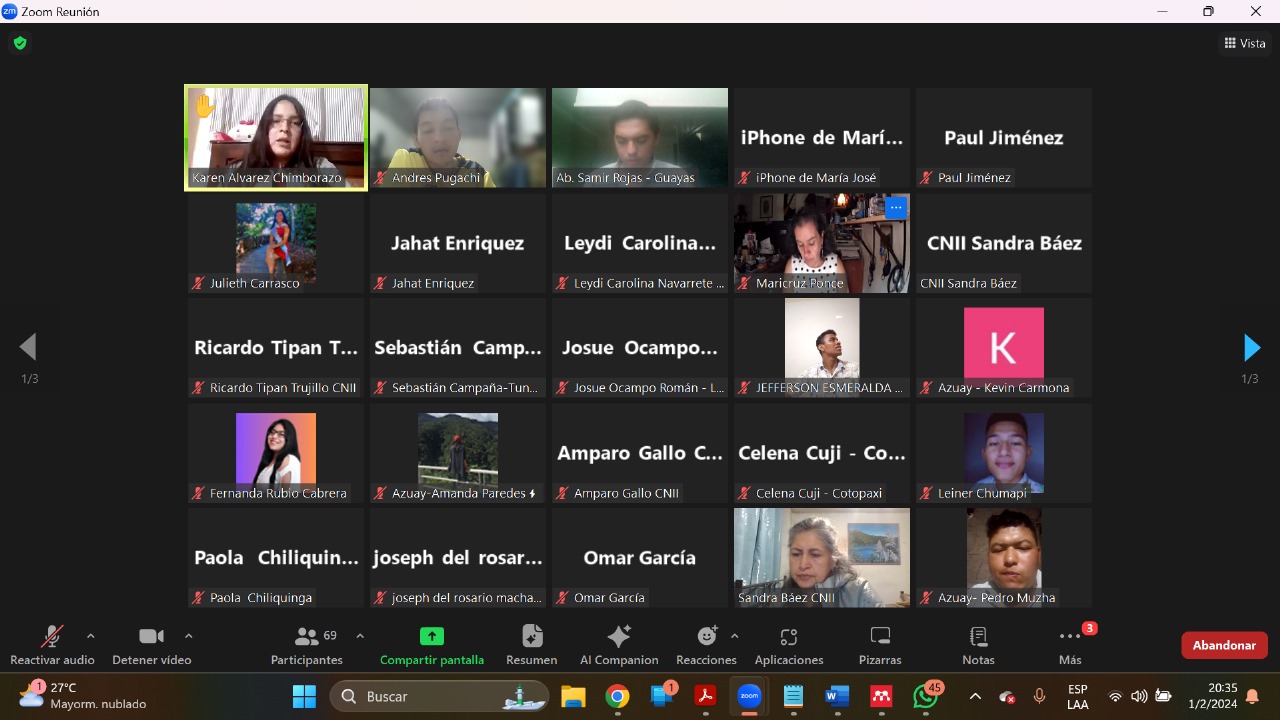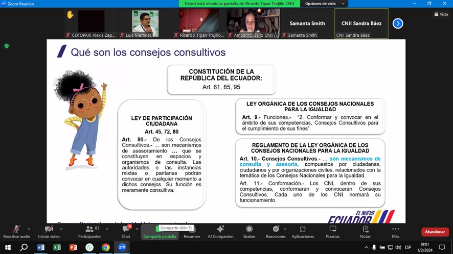 El 1 de febrero de 2024, se llevó a cabo la primera reunión virtual, del Consejo Nacional para la Igualdad Intergeneracional -CNII-, con el Consejo Consultivo Nacional de Jóvenes -CCNJ-, donde participaron 58 jóvenes.