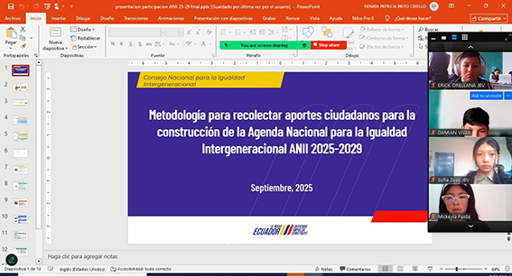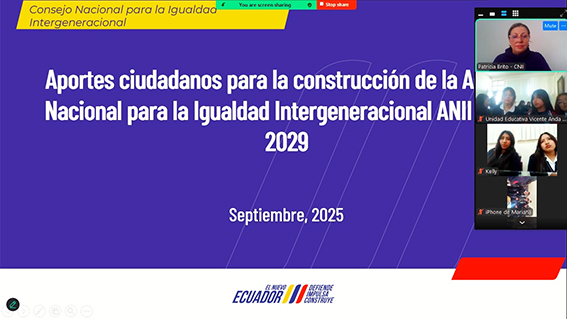 En el marco de la construcción de la Agenda Nacional para la Igualdad Intergeneracional 2025-2029, se desarrolló un conversatorio virtual con niñas, niños y adolescentes de los cantones de Azogues, Biblián y Déleg con el objetivo de recoger aportes desde los sujetos de derechos en los ejes de Educación Integral, Salud, Cultura y Deporte, Prevención de la Violencia y Acceso a la Justicia.