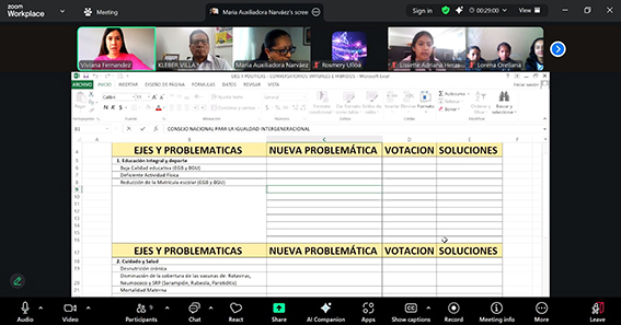 Este proceso participativo tuvo el objetivo de identificar las problemáticas de su grupo generacional y recoger aportes y propuestas de solución desde los distintos grupos de atención prioritaria. El diálogo se centró en los ejes de Educación Integral, Salud, Cuidado y Deporte, Trabajo y Seguridad Social, Prevención de la Violencia y Acceso a la Justicia.