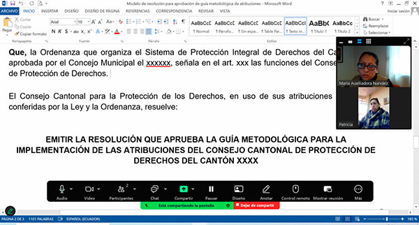 En el marco del cumplimiento de la hoja de ruta y diagnóstico del SPID 2025, acompañamos a la Secretaria Ejecutiva del Consejo Cantonal de Protección de Derechos de El Pan, para elaborar propuesta borrador de guía metodológica de atribuciones del CCPD y la propuesta borrador de resolución.