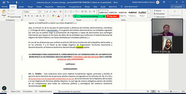 En el marco de la asistencia técnica el Consejo Cantonal de Protección de Derechos de Sevilla de Oro revisamos la propuesta de ordenanza que se encuentra en proceso de construcción para la aplicación de exoneraciones y descuentos establecidos en la Ley Orgánica de las Personas Adultas Mayores y personas con discapacidad.