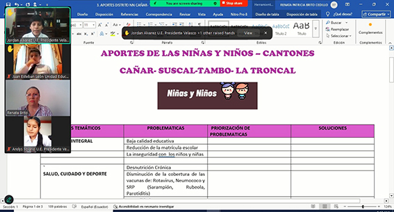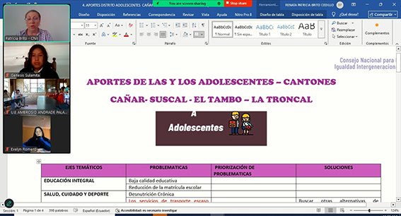 En el marco de la formulación de la Agenda Nacional para la Igualdad Intergeneracional, se llevó a cabo un conversatorio virtual con niñas, niños y adolescentes de los cantones de Cañar, Suscal, El Tambo y La Troncal. El objetivo de este encuentro fue recopilar los aportes de estos sujetos de derechos, abordando los ejes temáticos de Educación Integral, Salud, Cultura y Deporte, Prevención de la Violencia y Acceso a la Justicia.