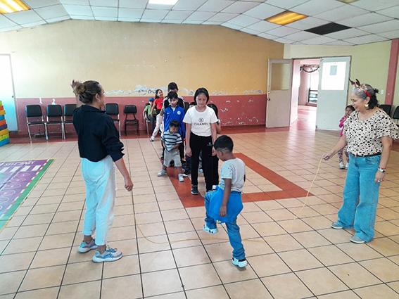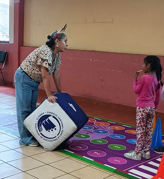 En el cantón Ambato, provincia de Tungurahua, trabajamos junto al Consejo Cantonal para la Protección de Derechos (CCPD) y la Secretaría de Derechos Humanos en el proyecto «Una moneda más, un derecho menos». Desde el Mercado Modelo, brindamos atención a niñas y niños que acompañan a sus padres en el comercio informal. El CCPD cuenta con un espacio seguro donde ellos pasan la jornada; allí, mediante actividades lúdicas, compartimos un entorno propicio para que conozcan sus derechos.