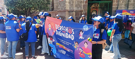 En el cantón Ambato, provincia de Tungurahua, participamos en el lanzamiento de la campaña «Derechos con Dignidad, por un Ecuador sin Mendicidad y sin Trabajo Infantil». Esta iniciativa del Ministerio de Derechos Humanos busca proteger a niñas, niños, adolescentes, personas adultas mayores y personas con discapacidad a través del fortalecimiento de la corresponsabilidad familiar, comunitaria e institucional.