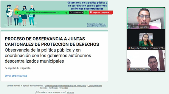 En Girón, Pedro Moncayo y Shushufinfi, en el marco del proceso de observancia a la política pública y herramientas de los Gobiernos Autónomos Descentralizados Municipales (GADM) para la conformación, funcionamiento, gestión, fortalecimiento de capacidades y perfil de miembros de las Juntas Cantonales de Protección de Derechos, realizamos encuestas a usuarios y miembros de dichas Juntas. El objetivo fue recabar la información necesaria para el proceso mencionado.