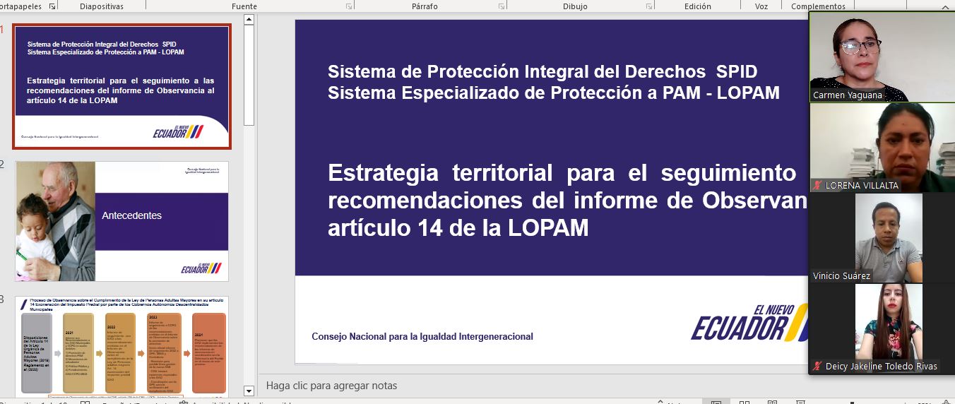 En el contexto del proceso de observancia, hemos realizado actividades orientadas a reforzar el trabajo en territorio y a proporcionar directrices para el cumplimiento de las actividades establecidas en el Artículo 14 de la Ley Orgánica de las Personas Adultas Mayores -LOPAM- (exoneración del pago del impuesto predial). Se han dado recomendaciones y acciones de difusión entre la población, especialmente personas adultas mayores, sus cuidadores, Consejos Consultivos de Personas Adultas Mayores y los funcionarios municipales, para que se lleve a cabo el proceso de exoneración del pago del impuesto predial, sus beneficios y el procedimiento para presentar quejas por cobros indebidos.