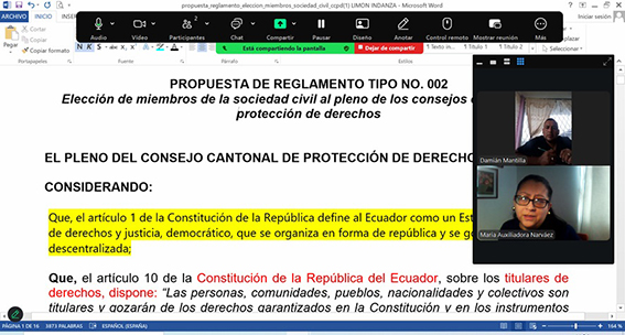 Vía telemática, trabajamos con el nuevo secretario ejecutivo del Consejo Cantonal de Protección de Derechos (CCPD) de Palora en la elaboración de una propuesta borrador del reglamento de elección de miembros de la sociedad civil. Simultáneamente, con el técnico de política pública del CCPD de Santa Isabel, abordamos el reglamento de elección de miembros de la Junta Cantonal de Protección de Derechos y se consideraron aspectos del plan de política pública de género.