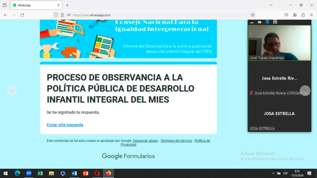 El equipo del CNII en planta central se reunió con el Consejo Cantonal de Protección de Derechos – CCPD Pedro Moncayo, provincia de Pichincha de manera telemática para brindar asistencia técnica en el ingreso de las encuestas aplicadas a las coordinadoras de los Centros de Desarrollo Infantil – CDI en Google Forms con el fin de retroalimentar los temas contemplados en el cuestionario de la fase 1, como parte del proceso de observancia a la política pública de desarrollo infantil.