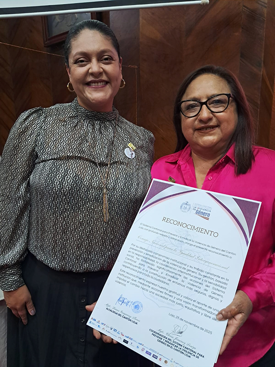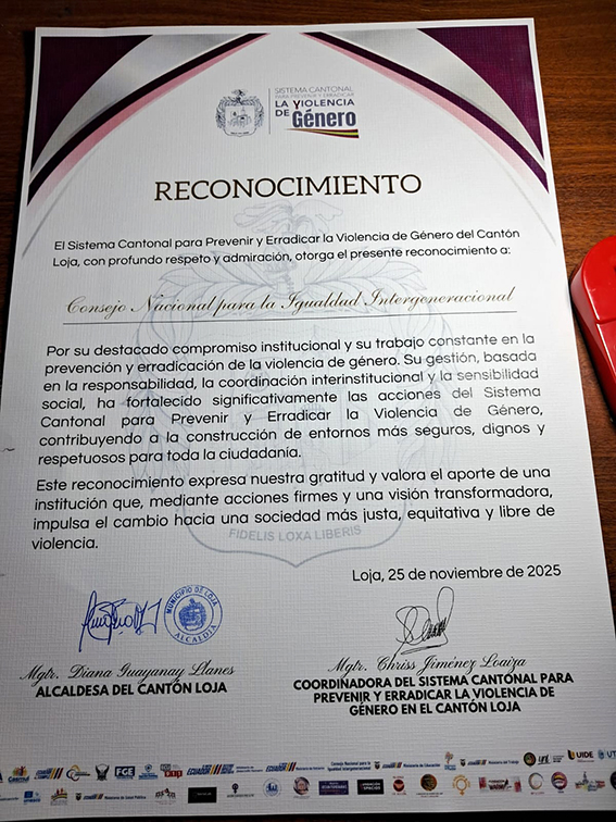 Durante el evento, la Autoridad Municipal, Alcaldesa Diana Guayanay, realizó un reconocimiento por el trabajo efectuado en la protección de derechos de los grupos de atención prioritaria durante este año 2025.