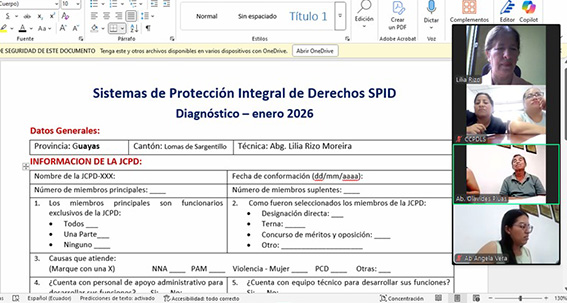 Vía telemática, realizamos el levantamiento de información sobre el Sistema de Protección Integral de Derechos (SPID) a los Consejos Consultivos Cantonales, Consejos y Juntas Cantonales de Protección de Derechos de los cantones Chilla, Atahualpa y Chaguarpamba. El objetivo de esta gestión es diagnosticar la situación actual de los sistemas locales para elaborar una hoja de ruta técnica que permita trabajar con eficiencia durante el 2026. Esta planificación busca fortalecer el SPID y garantizar el ejercicio pleno de los derechos de los grupos generacionales en territorio.
