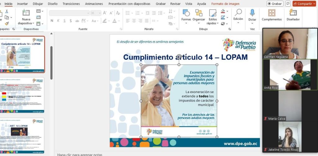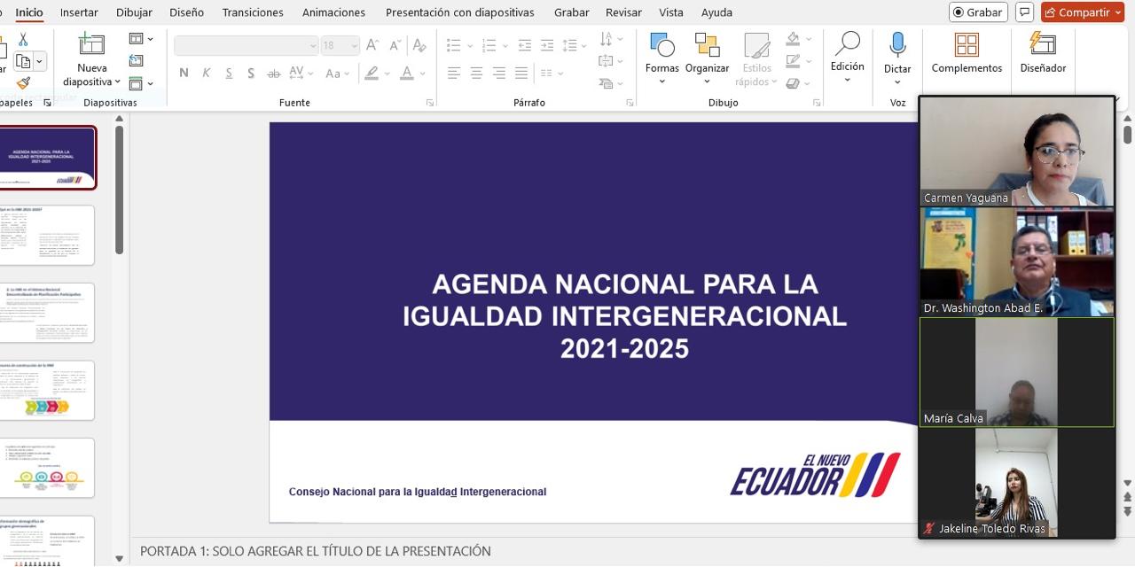 La reunión se desarrolló con la finalidad de coordinar, planificar actividades y revisar los avances del cumplimiento de varias actividades. Además, socializamos y analizamos el modelo de ordenanza para el sistema de protección integral de derechos, revisión y socialización de la Agenda Nacional para la Igualdad Intergeneracional – ANII, estrategias para el cumplimiento del artículo 14 de la