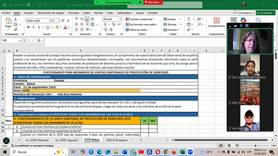 En los cantones de Riobamba, Guamote, Las Naves, Balzar, Marcabelí y Rumiñahui, realizamos el levantamiento de información, mediante la aplicación de encuestas a los miembros de las Juntas Cantonales de Protección de Derechos. Este proceso se enmarcó en la observancia de la política pública y de las herramientas de los Gobiernos Autónomos Descentralizados (GAD) Municipales, con el fin de evaluar la conformación, el funcionamiento, las capacidades y el perfil de los miembros de estas juntas.