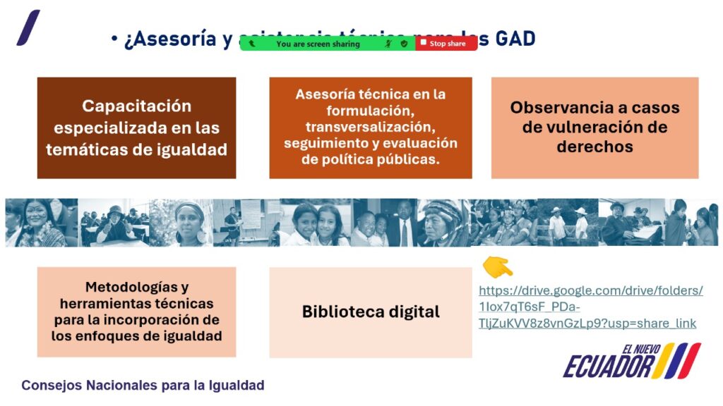 En articulación con la Secretaria Nacional de Planificación Coordinación Zonal 5 y 8, participamos como expositores de la estrategia nacional de los 5 Consejos Nacionales para la Igualdad, en la asistencia técnica que se da a los gobiernos autónomos descentralizados -GAD- de los 3 niveles de gobierno de la provincia de Galápagos, para que se incluyan las políticas de igualdad en los planes de desarrollo y ordenamiento territorial -PDOT-.
