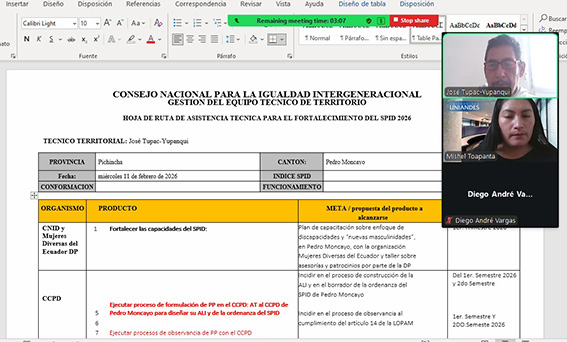 Mediante sesión telemática, coordinamos acciones con el Consejo Cantonal para la Protección de Derechos de Pedro Moncayo para la revisión, ajuste y aprobación de la Hoja de Ruta 2026. Este documento define la articulación y coordinación técnica para el presente periodo.