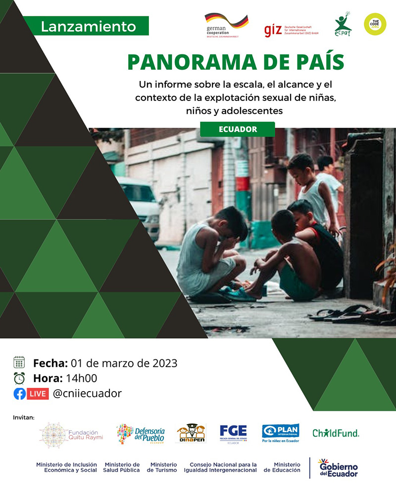 Este miércoles 1 de marzo, en el auditorio del MINEDUC, se realizará el lanzamiento del Panorama País de ECPAT, que comprende un informe sobre la escala, el alcance y el contexto de la explotación sexual de niñas, niños y adolescentes en el Ecuador (ESNNA). Esta iniciativa es impulsada por el Colectivo Interinstitucional contra la Explotación Sexual Comercial de Niñas, Niños y Adolescentes, que está dirigido actualmente por el Consejo Nacional para la Igualdad Intergeneracional.