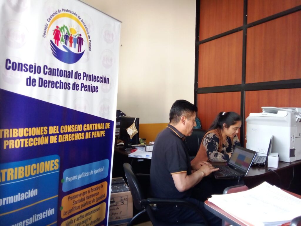 A través de una reunión de trabajo con la secretaria ejecutiva del Consejo Cantonal de Protección de Derechos y personal de la Junta Cantonal de Protección de Derechos de Penipe, abordamos el levantamiento de información sobre los indicadores del Sistema de Protección Integral de Derechos, tarea que implicó ciertas dificultades, debido al cambio de secretario ejecutivo y tener que realizar la revisión y búsqueda de la información disponible, para facilitar la entrega de los datos requeridos.