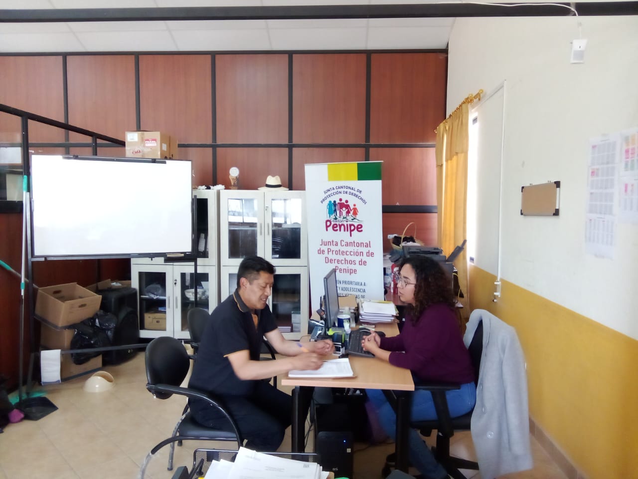 A través de una reunión de trabajo con la secretaria ejecutiva del Consejo Cantonal de Protección de Derechos y personal de la Junta Cantonal de Protección de Derechos de Penipe, abordamos el levantamiento de información sobre los indicadores del Sistema de Protección Integral de Derechos, tarea que implicó ciertas dificultades, debido al cambio de secretario ejecutivo y tener que realizar la revisión y búsqueda de la información disponible, para facilitar la entrega de los datos requeridos.