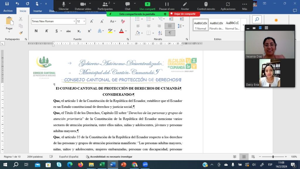 En Baños de Agua Santa, capacitamos a los nuevos miembros de la JCPD sobre los enfoques de igualdad, y la importancia de trabajar y articular el Sistema de Protección de Derechos en el cantón. Fue gratificante conocer que las autoridades del GADM han considerado las alertas expuestas, sobre contar con un equipo técnico que apoye el trabajo de la Junta de Protección, por lo cual a partir del 14 de febrero 2024, cuentan con el apoyo técnico y está conformada por los tres miembros principales y como equipo de apoyo, trabajo social y sicología.