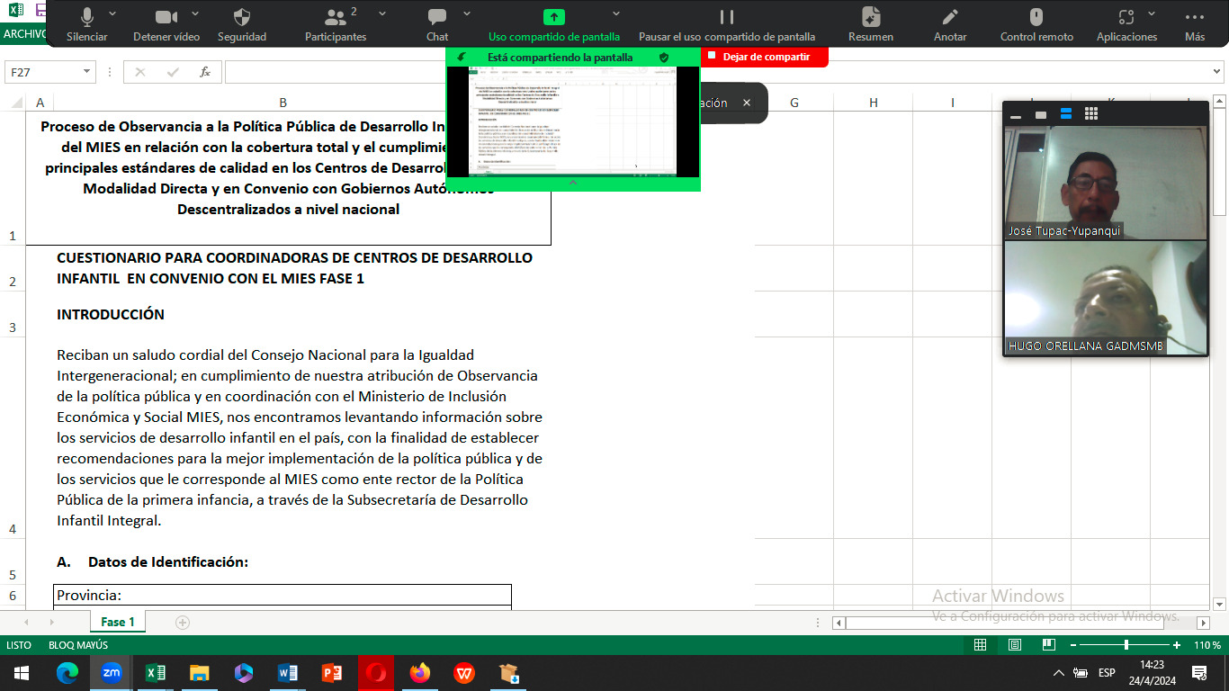El equipo del CNII revisó el instrumento para el levantamiento de información de la fase 1 del proceso de observancia a la política pública de desarrollo infantil, con el Consejo Cantonal de Protección de Derechos de San Miguel de Los Bancos. Entre los acuerdos se remitirá el cronograma con los nombres de encuestadores, para remitir al MIES y garantizar el acceso a los Centros de Desarrollo Infantil -CDI-. Las encuestas se realizarán hasta el 8 de mayo.