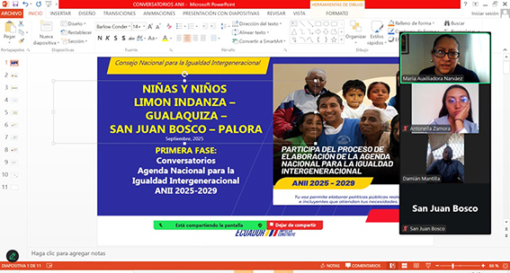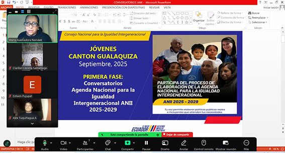 En el mismo cantón Gualaquiza, trabajamos vía telemática con los jóvenes, quienes también aportaron al proceso participativo de la construcción de la Agenda Nacional para la Igualdad Intergeneracional (ANII 2025–2029).