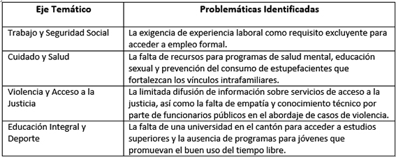 Las personas adultas mayores compartieron los problemas que padecen en sus cantones, cubriendo áreas clave como Educación Integral, Salud, Cuidado y Deporte, Trabajo y Seguridad Social, y Prevención de la Violencia y Acceso a la Justicia. Posteriormente, priorizaron aquellos que consideran que deben ser atendidos de forma urgente y/o para los cuales se deben formular políticas públicas de manera inmediata.