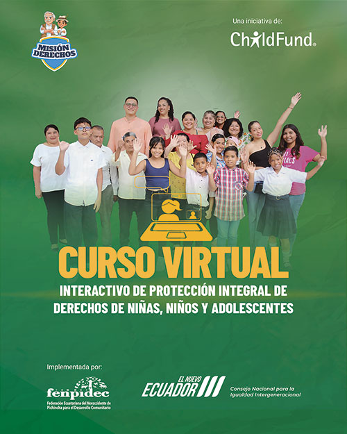 Desde el Consejo Nacional para la Igualdad Intergeneracional, junto a ChildFund International y la Federación Ecuatoriana del Noroccidente de Pichincha para el Desarrollo Comunitario, presentamos el curso virtual interactivo “Misión Derechos”, que cuenta con el aval de la Universidad Técnica Particular de Loja.