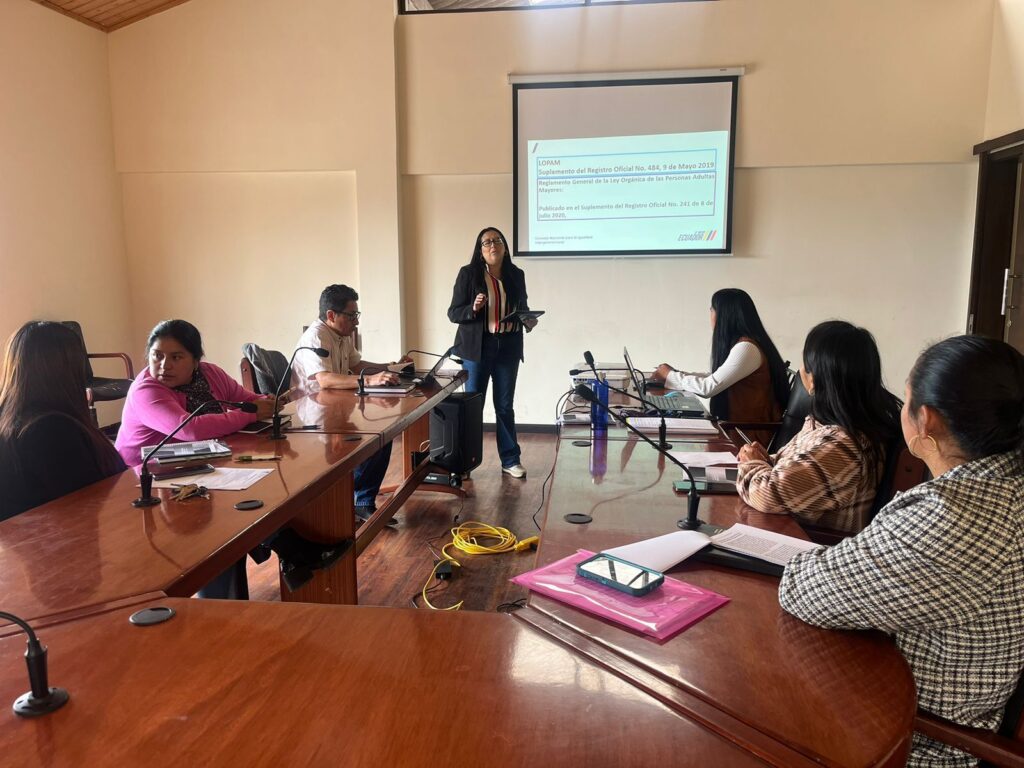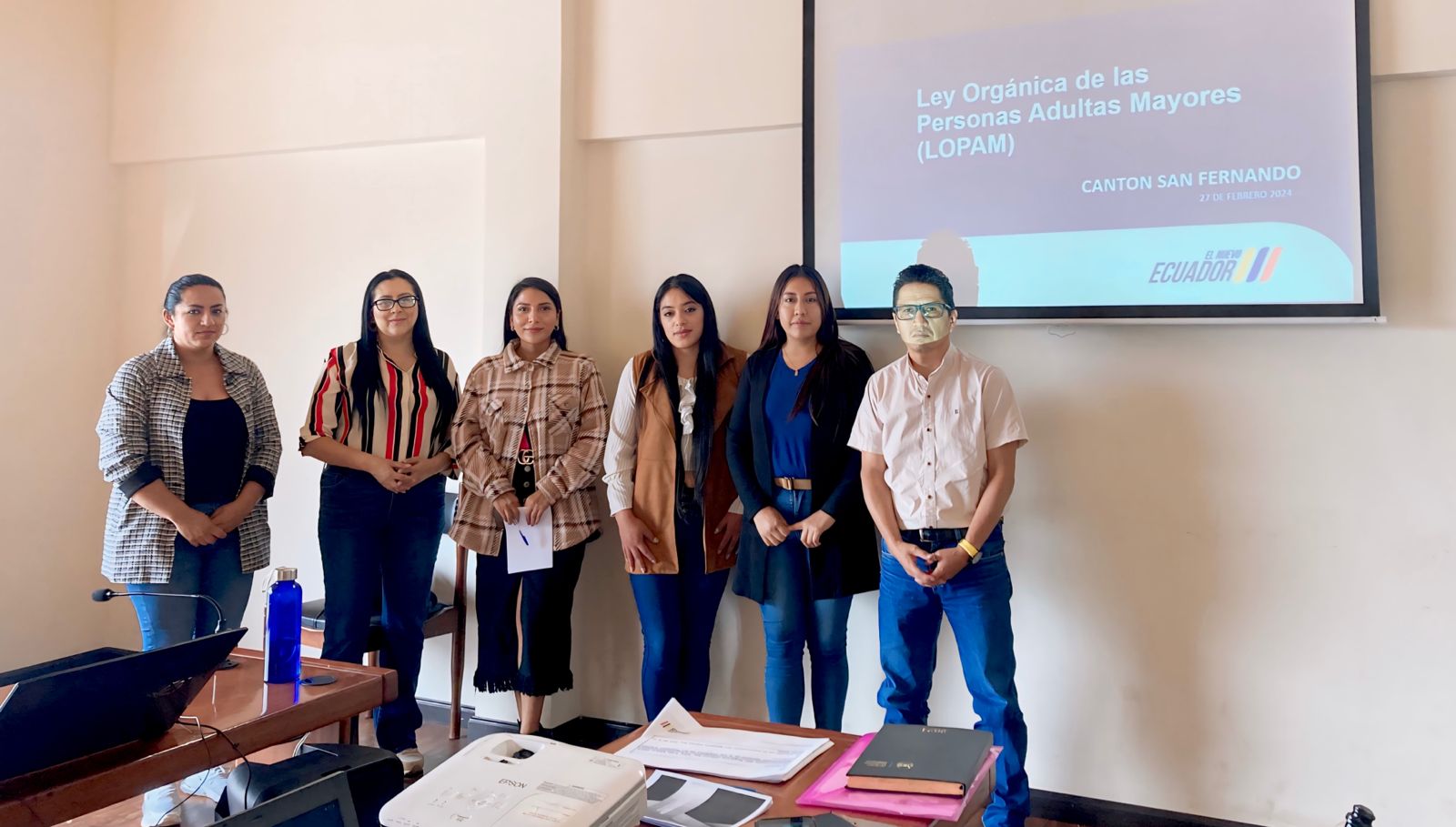 El equipo del CNII en articulación con el Consejo Cantonal de Protección de Derechos de San Fernando de la provincia del Azuay, en cumplimiento de la Ley Orgánica de las Personas Adultas Mayores -LOPAM-, socializa esta herramienta normativa a funcionarios del Gad Municipal y la estrategia territorial, para el seguimiento a las recomendaciones del Informe de Observancia, al artículo 14 de la LOPAM junto a la Defensoría del Pueblo.